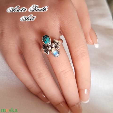Türkiz-Holdkő gyűrű ezüst virágszirmokkal