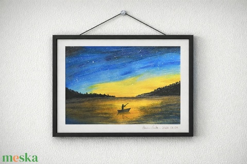 művészet, festmény, festmény vegyes technika, csónak, éjaszaka, horgászat, holdfény, éjjelihorgászat, magány
