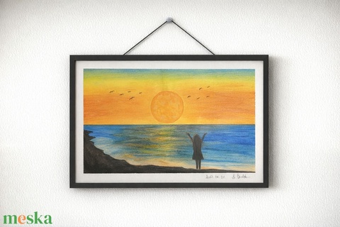 művészet, festmény, festmény vegyes technika, tengerpart, vízpart, szabadság, holdfény, naplemente, boldogság