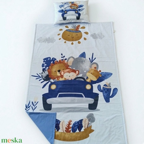 Autós állatos ovis ágynemű szett - kék– töltött, pamut, egybevarrt