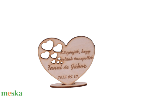 Tedd emlékezetessé az esküvőd napját egyedi, szív alakú gravírozott köszönőajándékokkal! A vendégeid számára egy különleges, személyre szabott ajándék, amely örök emlék marad. A névvel, dátummal és egyedi felirattal gravírozott fa dísz elegáns és megható gesztus, amely tökéletesen kiegészíti az esküvői dekorációt is.