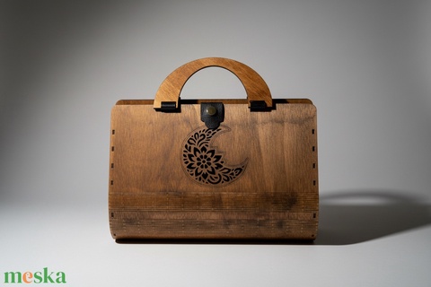 Az alkalmi kézitáska 3 mm-es rétegelt nyírfa lemezből készült, lézervágással. Pácolást és selyemfényű lakkot kapott, Fekete műbőr béléssel. Méretei: 28 x 19 cm, 9 cm mélységgel. Használati és Ápolási Útmutató