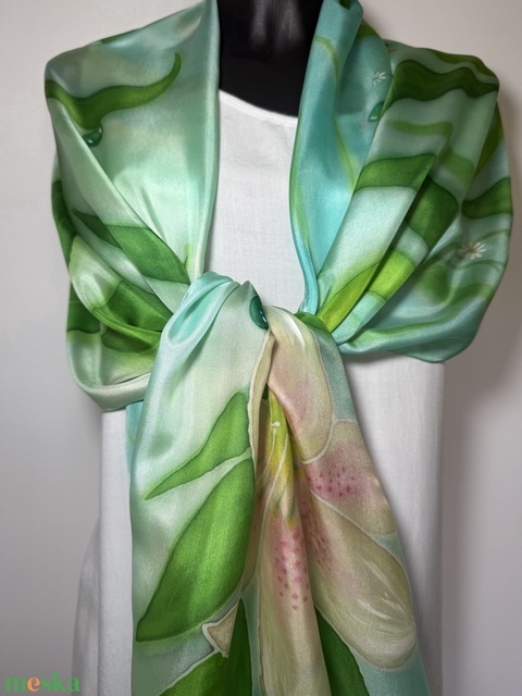 Harmatvirág kézzel festett selyemsál – zöld-türkiz elegancia