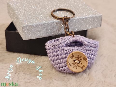 Kézműves horgolt kulcstartó - Shopping bag (virágmintás gomb dekorációval - 2026.)
