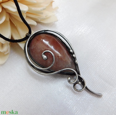 A medál Tiffany technikával készült vörös rutilkvarc és ólommentes, ezüsttartalmú ón felhasználásával. A diszítés szintén saját készítésü, nem tartalmaz gyári elemeket. A fémrészt óezüstre patináztam és lelakkoztam, hogy sokáig szép maradjon.
