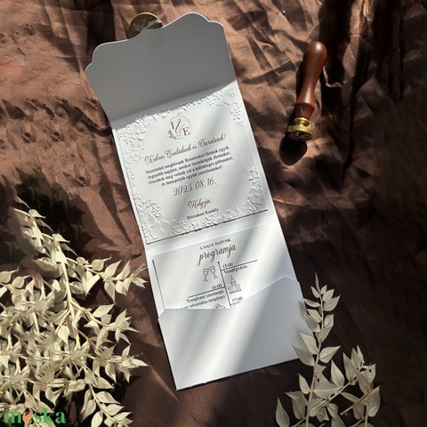 Dombornyomott, zsebes esküvői meghívó viaszpecséttel
