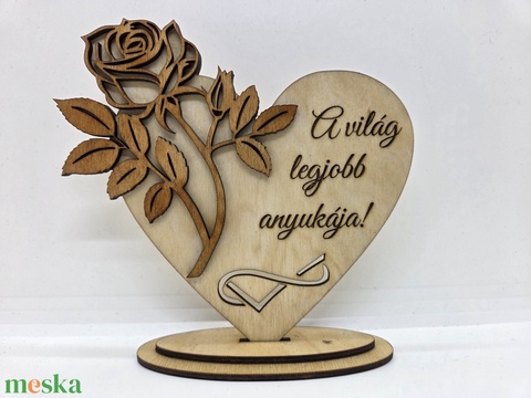 Anyák napjára - Fa gravírozott szív dísz rózsával – egyedi felirattal