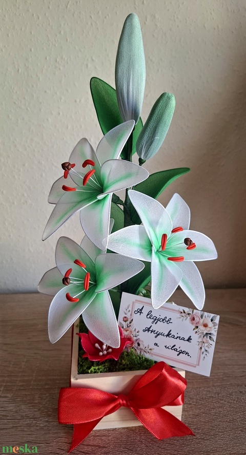 Keresed a tökéletes ajándékot, ami sosem hervad el .Szívvel-lélekkel készült, egyedi harisnyavirág kompozíció. Különlegessége, hogy minden egyes liliomszirmot saját kezűleg festettem es keszitettem, így nincs két egyforma darab!