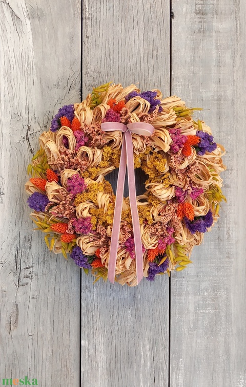 - Anyag/Összetevő szalag, szalmakoszorúalap, szárazvirágok, szárítottnövények, háncskötegek