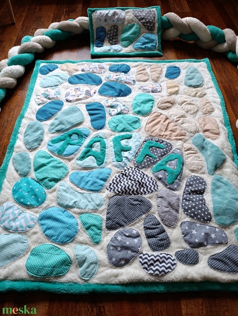 Kövek a víz tükrén Patchwork babatakaró névvel és kis párnával, hátán egyedi személyre szabott ajándékról szóló címkével