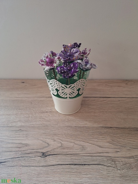Textil virágok fehér vödörben