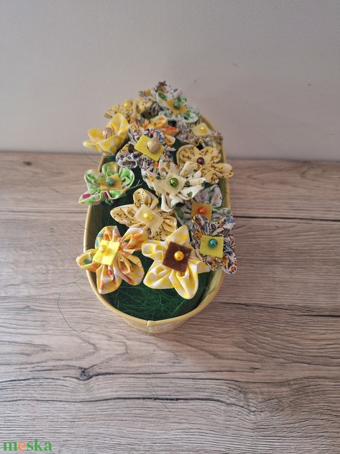 Textil virágok sárga kaspóban