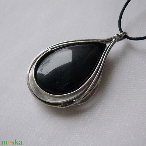 A medál Tiffany technikával készült szivárvány obszidián és ólommentes, ezüsttartalmú ón felhasználásával. A díszítés szintén saját készítésű, nem tartalmaz gyári elemeket. A fémrészt óezüstre patináztam, lekezeltem antioxidánsal és lelakkoztam, hogy sokáig szép maradjon.