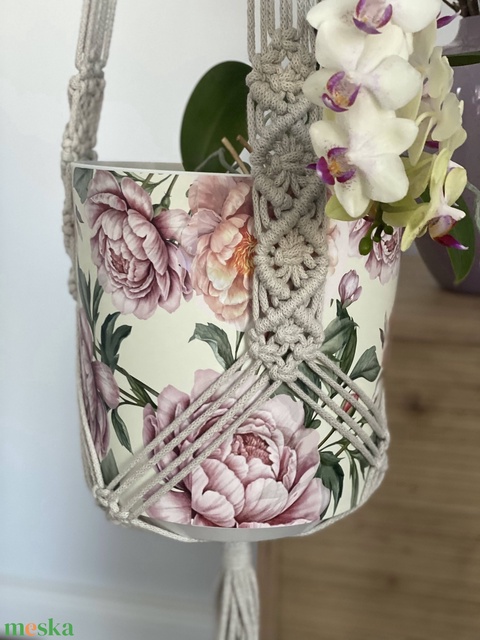 Virágtartó, makramé, bézs