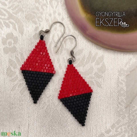 Fényes sötétpiros-matt fekete gyöngyfűzött rombusz fülbevaló