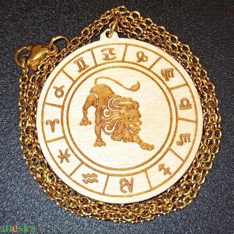 Egyedi készítésű Oroszlán horoszkópos nyaklánc natúr fa medállal.