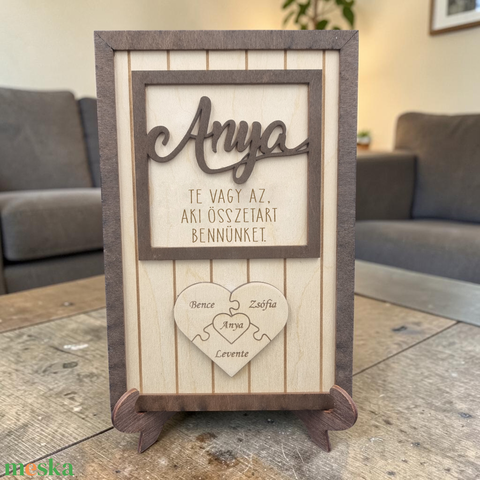 A középpontban egy puzzle szív áll, amelyben a családtagok nevei jelennek meg, ezzel szimbolizálva, hogy Anya tart össze benneteket. A szívre kérhető gravír egy választott betűtípussal, illetve a tábla közepére is 2 stílusban kérhető, vagy akár egyedi felirattal.