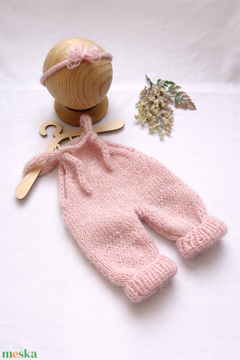 Kézzel kötött újszülött kantáros nadrág és fejpánt