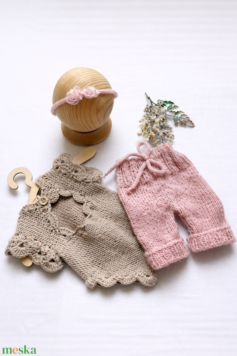 Kézzel kötött újszülött kantáros nadrág és fejpánt