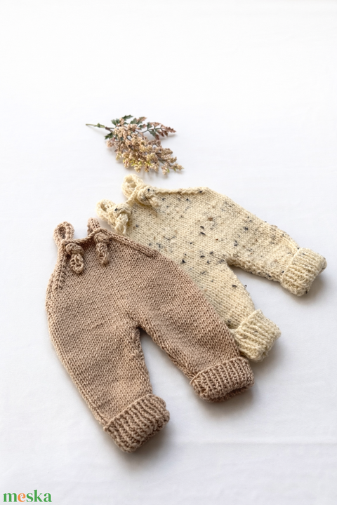 Kézzel kötött újszülött kantáros nadrág és fejpánt