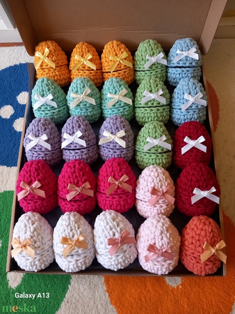 Újrahasznosított pamut zsinórfonalból készült. Nyitható kis horgokt tojások. Egy kis csokitojás vagy festett tojás fér el benne. De akár apró ajándékoknak is tökéletes😊