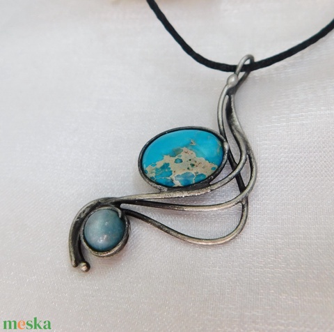 A medál Tiffany technikával készült variszcit (üledéki jáspis), kianit, réz és ólommentes, ezüsttartalmú ón felhasználásával. A díszítés szintén saját készítésű, nem tartalmaz gyári elemeket. A fémrészt óezüstre patináztam és lelakkoztam, hogy sokáig szép maradjon.