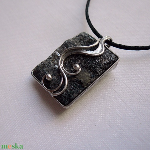 A medál Tiffany technikával készült nyers fekete turmalin ( sörl ) és ólommentes, ezüsttartalmú ón felhasználásával. A díszítés szintén saját készítésű, nem tartalmaz gyári elemeket. A fémrészt óezüstre patináztam, lekezeltem antioxidánssal és lelakkoztam, hogy sokáig szép maradjon.