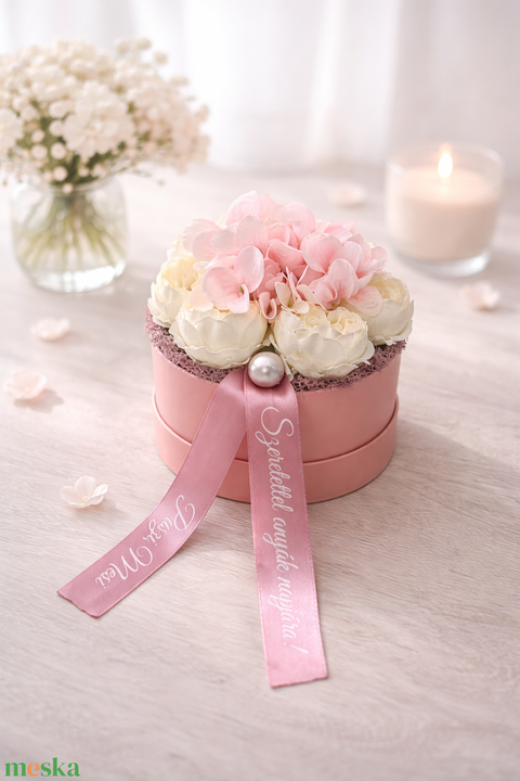 Anyák napi virágbox köszönő szalaggal - hortenzia és rózsa