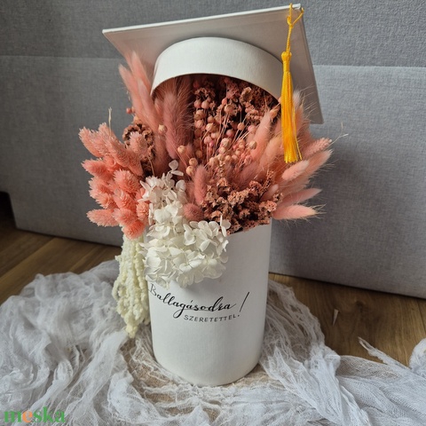 Ballagási kalap virágbox, virágdoboz, talár, diploma ajándék, szárazvirág box
