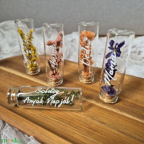 Szárazvirág üvegfiolák, üvegbúra, Anyák napjára, köszönőajándéknak