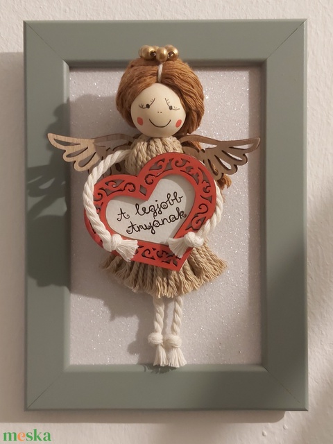 - Anyag/Összetevő makramé fonal, fagyöngy, fagolyó, fa szivecske, képkeret
