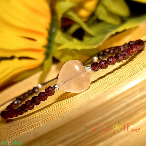 - Anyag/Összetevő poliészter zsinór, sterlingezüst, rózsakvarc, gránát