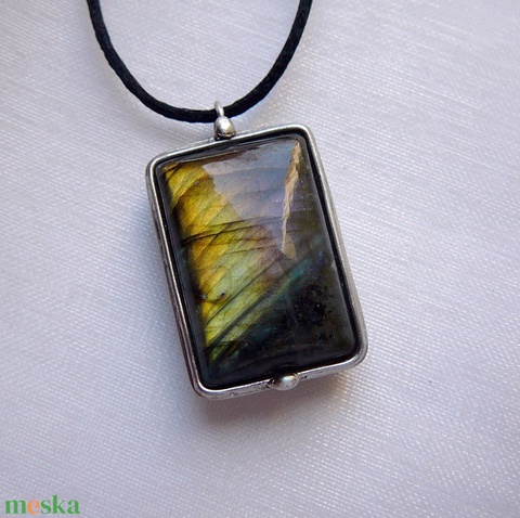 A medál Tiffany technikával készült labradorit és ólommentes, ezüsttartalmú ón felhasználásával. A díszítés szintén saját készítésű, nem tartalmaz gyári elemeket. A fémrészt óezüstre patináztam, lekezeltem antioxidánsal és lelakkoztam, hogy sokáig szép maradjon.