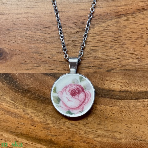 Francia mentett porcelán darabok - rózsás nyaklánc - nemesacél kerek medálos