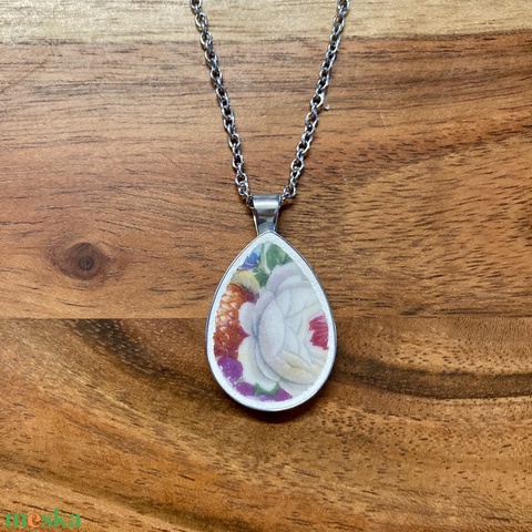 Francia mentett porcelán darabok - rózsás nyaklánc - nemesacél csepp medálos