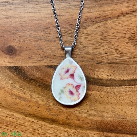Francia mentett porcelán darabok - virágos nyaklánc - nemesacél csepp medálos