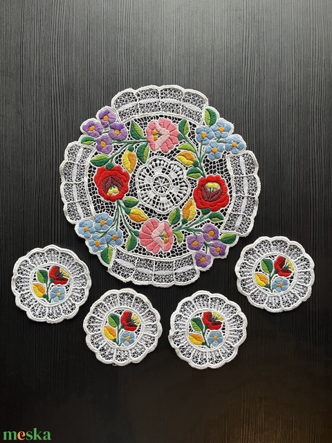 Kalocsai mintás riselt terítők - Szett - 1+4 (1 db - Ø27 cm és 4 db - 11 x 11cm)
