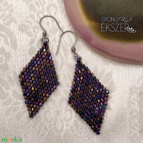 Fényes, irizáló lila gyöngyfűzött rombusz fülbevaló