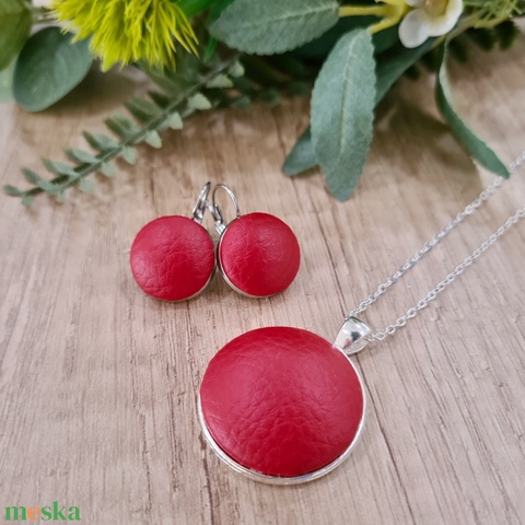 Fényes piros - ezüst textilbőr fülbevaló és nyaklánc szett