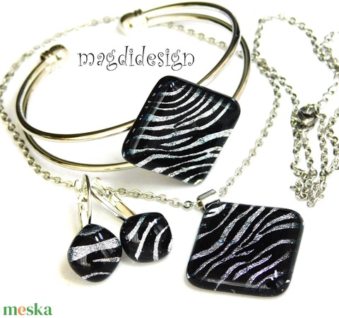 EXKLUZÍV Fekete ezüst zebra üvegékszer szett nyaklánc, karkötő, fülbevaló - Anyák napjára, ballgásra