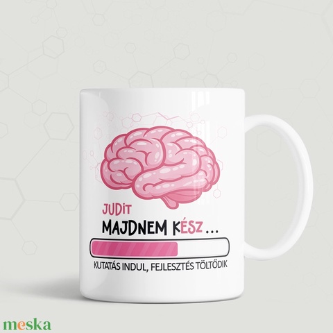 A „Nyugalom, az ész dolgozik” és a „Judit majdnem kész… Kutatás indul, fejlesztés töltődik” felirat egyszerre vicces, ötletes és igazán emlékezetes. Ideális választás születésnapra, névnapra, diploma mellé, munkahelyi meglepetésnek vagy csak úgy, egy jó poén kedvéért.