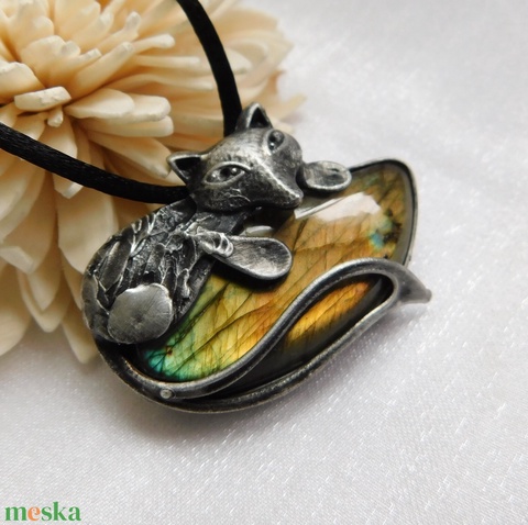 A medál Tiffany technikával készült labradorit, réz és ólommentes, ezüsttartalmú ón felhasználásával. A díszítés szintén saját készítésű, nem tartalmaz gyári elemeket. A fémrészt óezüstre patináztam és lelakkoztam, hogy sokáig szép maradjon.