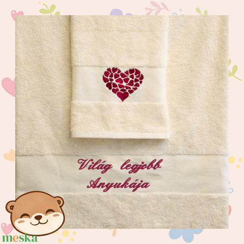 Ez a prémium minőségű, hímzett törölköző szett elegáns ivory színben készült, többféle választható színű felirattal.