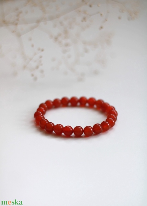Ugyanakkor a karneol hat a gyökércsakrára, a Muladharára is. Ez a legalsó csakra felel a földeltségért, a biztonságérzetért és az életerő alapjáért. A karneol itt mély gyökereket ereszt, segít talajt fogni a mindennapokban, hogy ne sodródj el a gondolatok vagy az érzelmek áradatában. Így a viselője egyszerre érezheti magát inspiráltnak és stabilnak, kreatívnak és mégis biztos talajon állónak. A két csakra – a gyökér és a szakrális – közötti harmónia révén a karneol karkötő olyan, mintha egy híd lenne a testi lét és a lelki-szellemi áramlás között: földel, miközben felemel, stabilizál, miközben felszabadít.