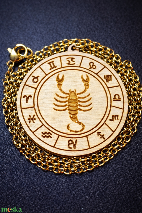 ékszer, nyaklánc, medálos nyaklánc, horoszkop, gravírozott, fa, zodiák, csillagjegy, ajándék, születésnap, női, férfi, skorpió, anyák, misztikus, spirituális, kézműves, napi, szerencsehozó, egyedi