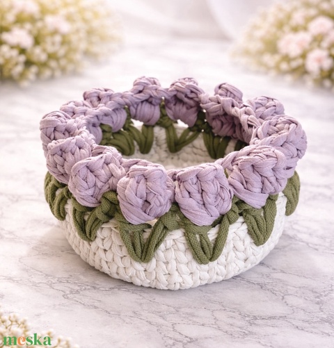 Lila tulipános horgolt kosár
