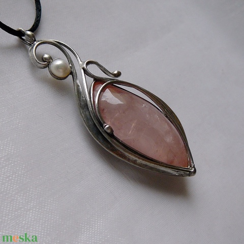 A medál Tiffany technikával készült rózsakvarc és ólommentes, ezüsttartalmú ón felhasználásával. A díszítés szintén saját készítésű, nem tartalmaz gyári elemeket. A fémrészt óezüstre patináztam és lelakkoztam, hogy sokáig szép maradjon.