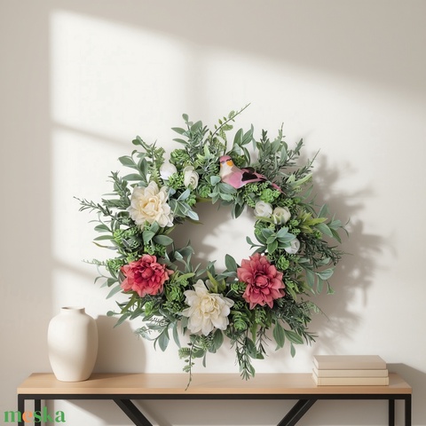 Virágos koszorú kismadárral- természetes hatású, élethű
