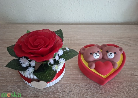 2️⃣ Szíves maci pár: Kézzel öntött és egyedileg festett gipsz figura, mely két egymáshoz bújó macit ábrázol egy nagy piros szívvel. Kedves emlék, mely minden polcon jól mutat.
