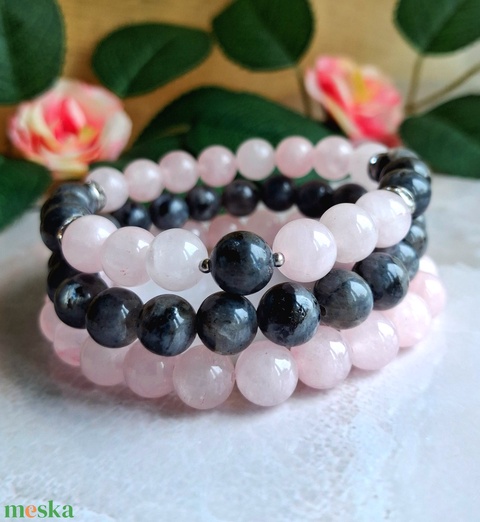 Larvikit és rózsakvarc ásvány karköt szett- 3 db